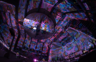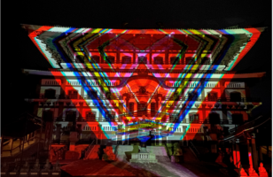 今回の「PEACE OF LIGHT」では、デジタル掛け軸を中心に、その光に織り込むように、3つのパフォーマンスがコラボレーションして上演。まずは、アーティスト達が制作した光の中に佇む祈りの動物オブジェに地元商店主がキャンドルを持ち寄るパフォーマンス。続いて、光に導かれ寄り添うような美しいピアノとソプラノの演奏。最後に、古典尺八の持つ「一音成仏」のコンセプトをデジタル掛け軸に融合させる尺八の演奏が行われました。